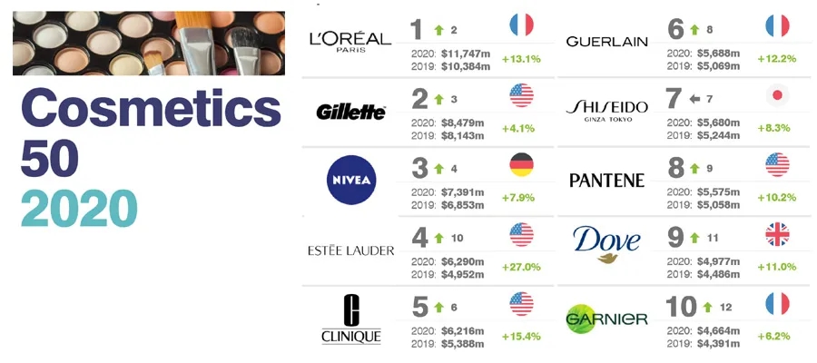 Brand Finance, a UK Brand assessment agency, publishes its "World's 50 Most Valuable COSMETICS and personal care Brands 2020".